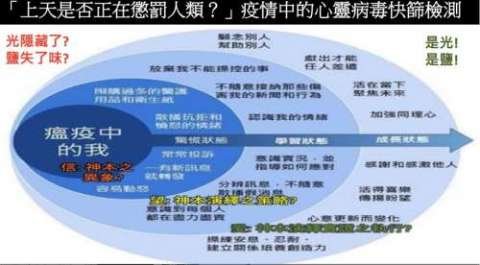 在疫情中,我們可以藉此快速的看見自己的心態與待人處事⽅法是否也染了個比新冠病毒更 可怕的心靈舊冠病毒; 若多少有⼀點,我們可以培養什麼様的心態與方法以面對疫情 及任何困難,以致在困難中有平安,有正確的信⼂望⼂愛,帶出正確的異象⼂策略⼂執行,能從驚慌狀態,進到學習狀態,以致到成長與成熟的狀態,能幫助自己也幫助別人?